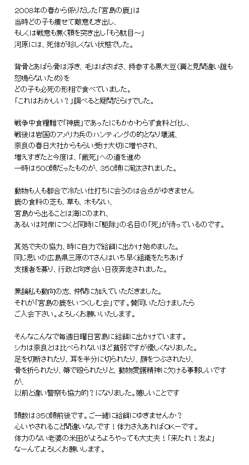 広島宮島鹿通信 (米田様のブログ) http://sikamama.blog9.fc2.com/blog-date-201101.html 2011.01.12 「宮島の鹿を愛する会」