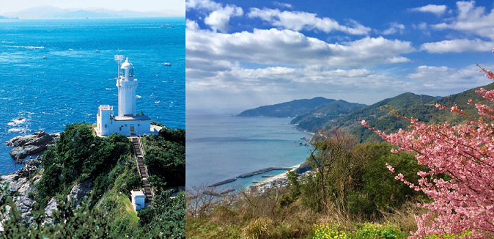 (画像右は佐田岬半島の中央部あたりの展望台から見た宇和海側の風景、左は半島の最西端にある佐田岬灯台です)